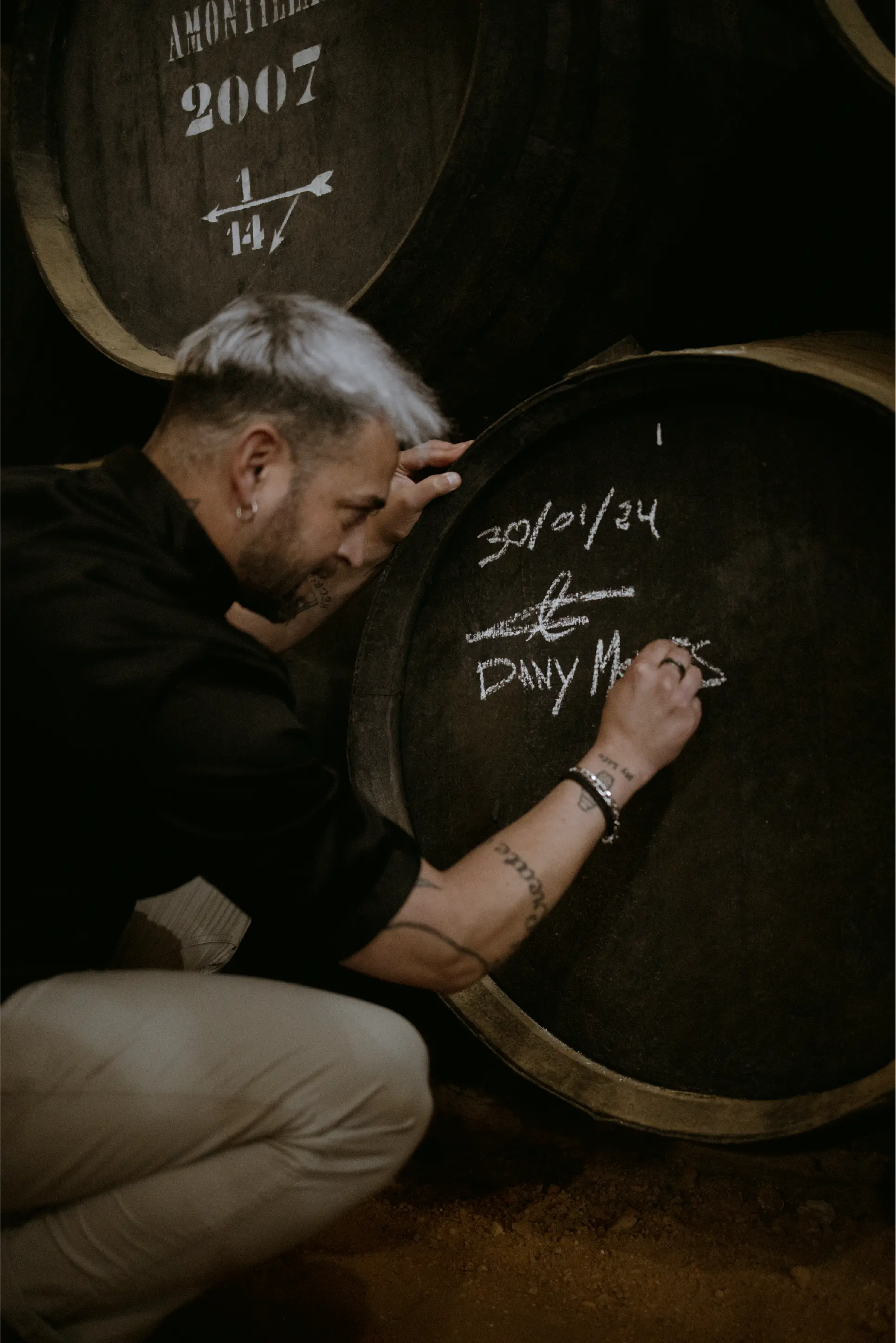Dany Morales, ganador de Master Cocktail 2023, en las bodegas Williams & Humbert, firmando una bota.